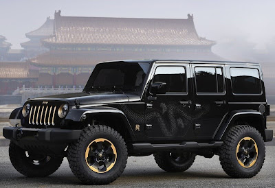 CAR GARAGE | Jeep Wrangler Dragon Concept (2012) | The Wrangler Dragon design concept is the first Jeep vehicle designed specifically with Chinese elements in mind and showcases the opportunity for special editions That Might Be available for China in the near future. The Jeep Wrangler concept is based on Dragon China a Wrangler Unlimited Rubicon-market painted black with a black body-color three-piece hard top. From there, the designers incorporated Numerous bronze-gold details - a color associated with the dragon. The Jeep brand introduced the Jeep Wrangler "Dragon" design concept at the 2012 Beijing International Automotive Exhibition. The concept integrates two icons together in one: the Wrangler, as the off-road icon of the Jeep brand, and the honored Chinese dragon.